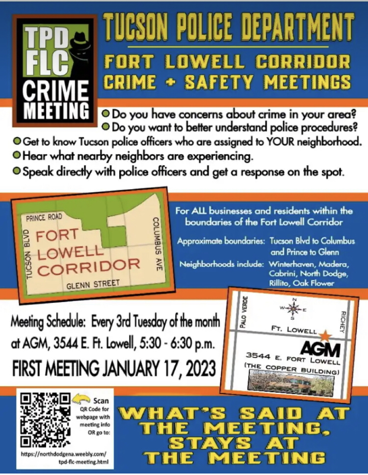 We highly recommend going to the TPD meetings posted below. We would like to have a strong Cabrini presence. Meetings are every third Tuesday 530 to 6:30 PM every month. Located at the AGM building at 3544 E. Fort Lowell Road.